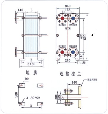 框架包括一個(gè)固定壓緊板和一個(gè)活動(dòng)壓緊板,由上導(dǎo)桿與下導(dǎo)桿支承,在另‘端有一支柱。壓制成的波紋板片懸掛在兩板之間的上導(dǎo)桿上,移動(dòng)活動(dòng)壓緊板將板片組壓緊,再用一組夾緊螺柱將固定壓緊板和活動(dòng)壓緊板夾緊至一定尺寸。兩種介質(zhì)經(jīng)固定(或活動(dòng))壓緊板上法蘭孔流入由波紋板片組成的各自通道,熱交換后介質(zhì)再由固定(或活動(dòng))壓緊板上的法蘭孔流出。同定壓緊板、活動(dòng)壓緊板、支柱及導(dǎo)桿均為低碳鋼??紤]到用戶的多種使用要求,框架設(shè)計(jì)有多種型式,主要有雙支撐框架式和常用的落地式等,也可根據(jù)用戶的要求更改框架的型式。