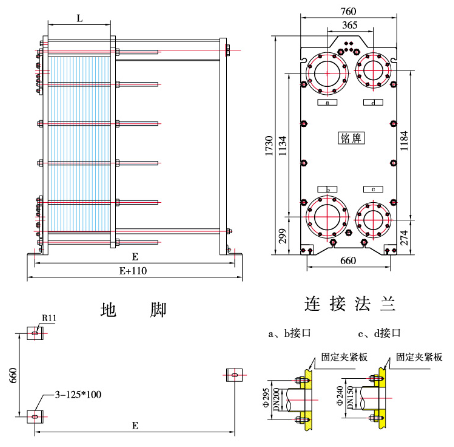 框架包括一個固定壓緊板和一個活動壓緊板,由上導桿與下導桿支承,在另‘端有一支柱。壓制成的波紋板片懸掛在兩板之間的上導桿上,移動活動壓緊板將板片組壓緊,再用一組夾緊螺柱將固定壓緊板和活動壓緊板夾緊至一定尺寸。兩種介質(zhì)經(jīng)固定(或活動)壓緊板上法蘭孔流入由波紋板片組成的各自通道,熱交換后介質(zhì)再由固定(或活動)壓緊板上的法蘭孔流出。同定壓緊板、活動壓緊板、支柱及導桿均為低碳鋼??紤]到用戶的多種使用要求,框架設(shè)計有多種型式,主要有雙支撐框架式和常用的落地式等,也可根據(jù)用戶的要求更改框架的型式。