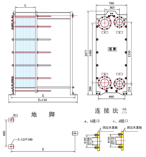 框架包括一個固定壓緊板和一個活動壓緊板,由上導桿與下導桿支承,在另‘端有一支柱。壓制成的波紋板片懸掛在兩板之間的上導桿上,移動活動壓緊板將板片組壓緊,再用一組夾緊螺柱將固定壓緊板和活動壓緊板夾緊至一定尺寸。兩種介質(zhì)經(jīng)固定(或活動)壓緊板上法蘭孔流入由波紋板片組成的各自通道,熱交換后介質(zhì)再由固定(或活動)壓緊板上的法蘭孔流出。同定壓緊板、活動壓緊板、支柱及導桿均為低碳鋼??紤]到用戶的多種使用要求,框架設計有多種型式,主要有雙支撐框架式和常用的落地式等,也可根據(jù)用戶的要求更改框架的型式。